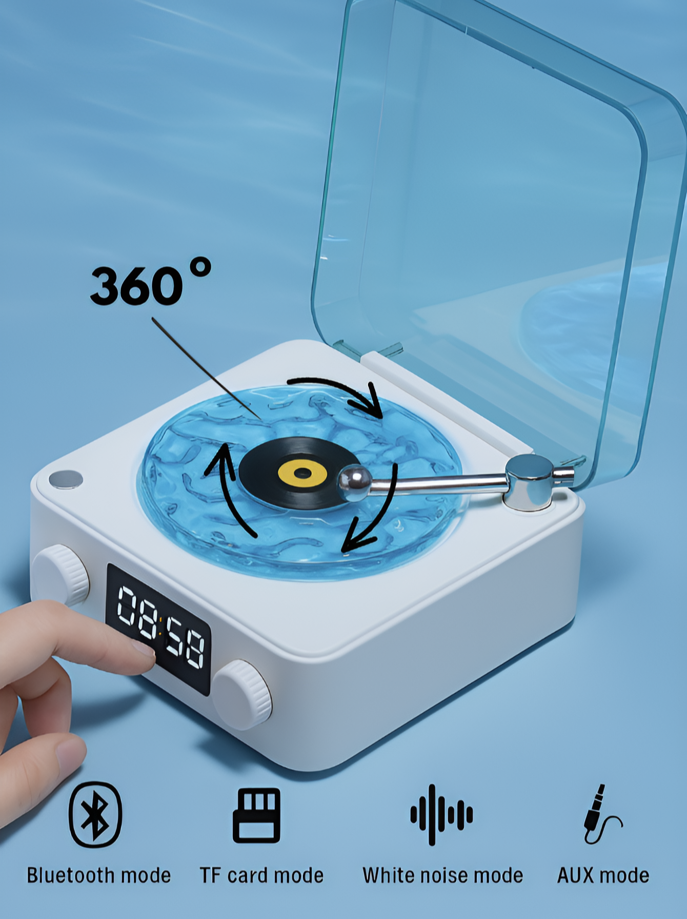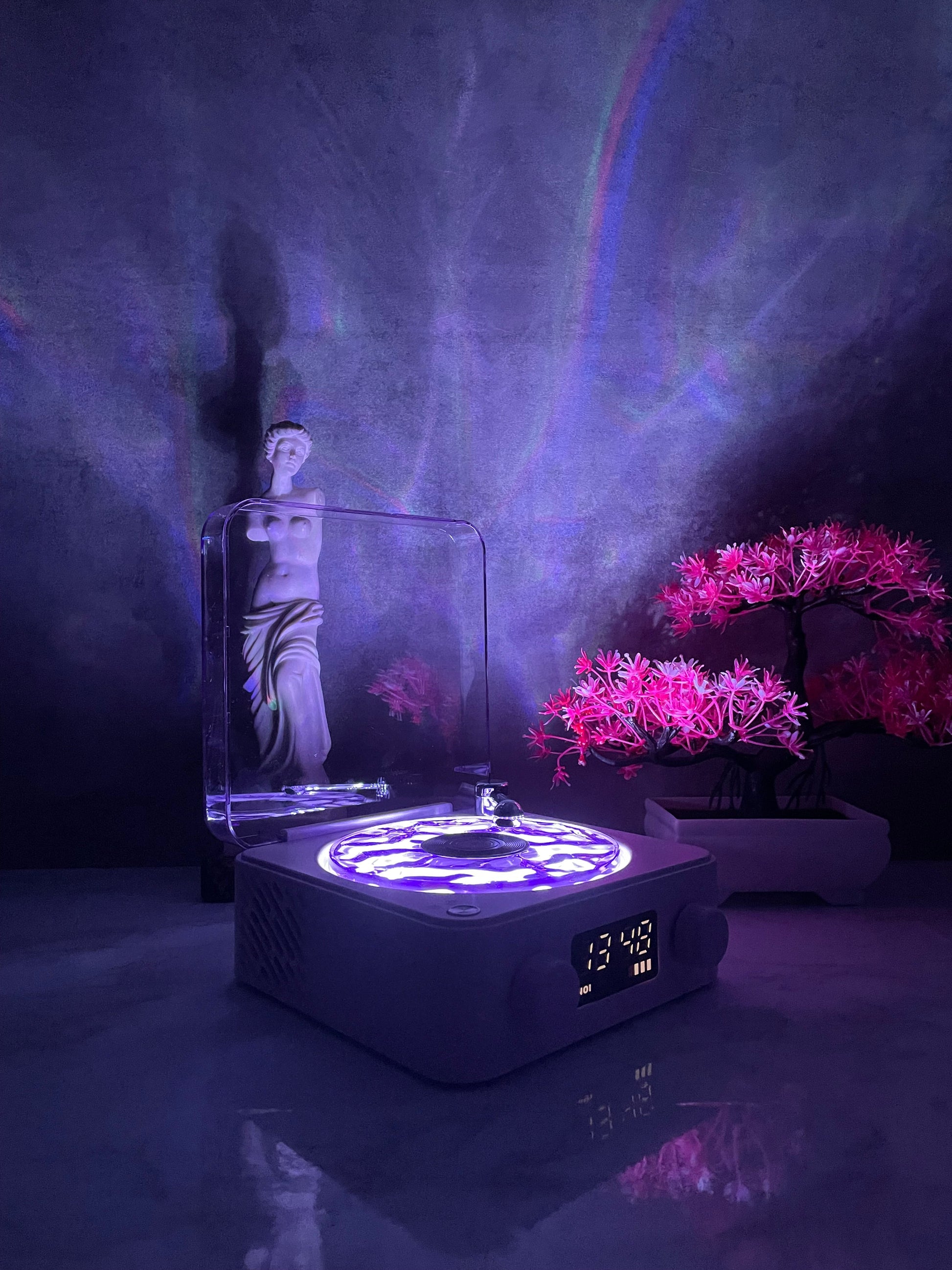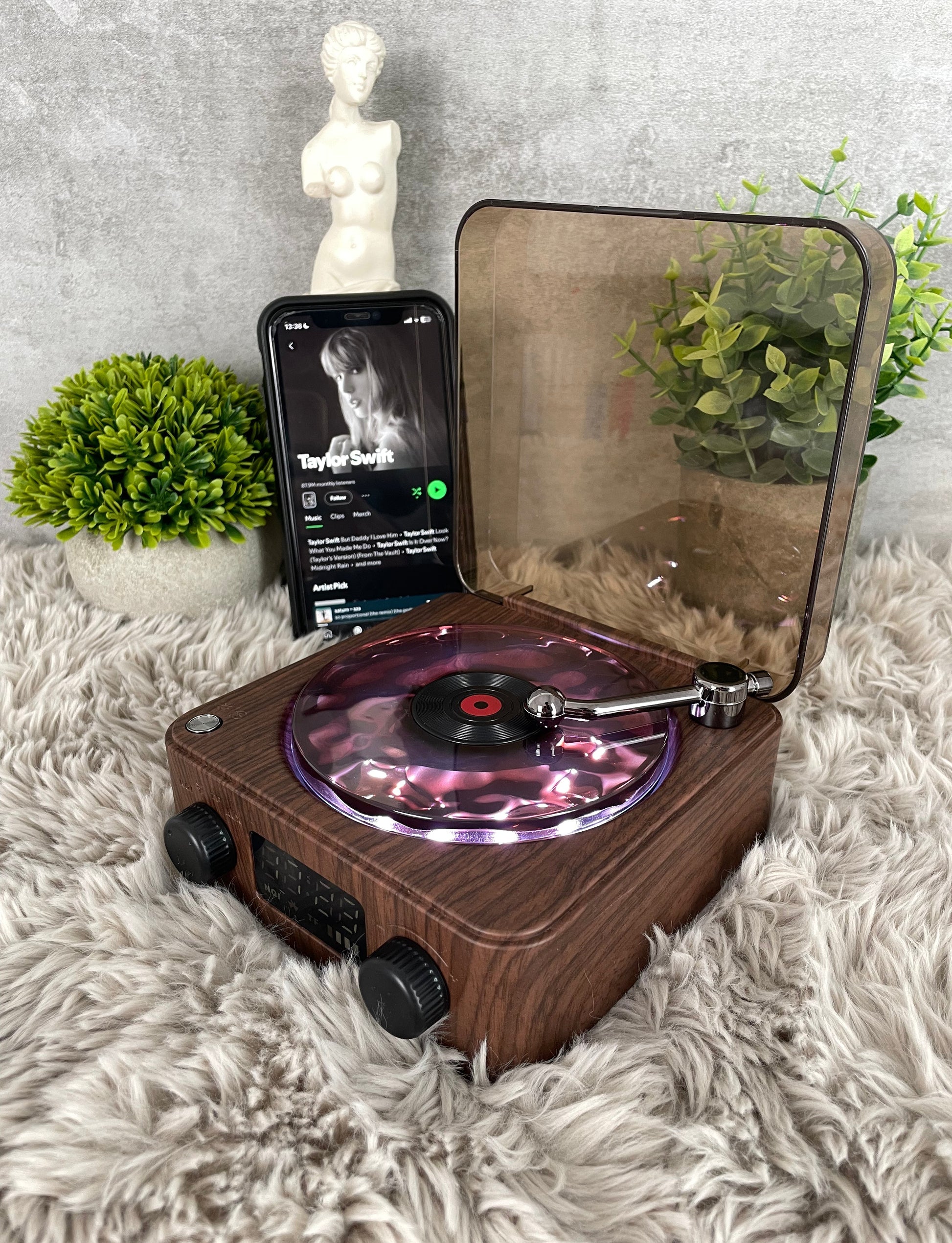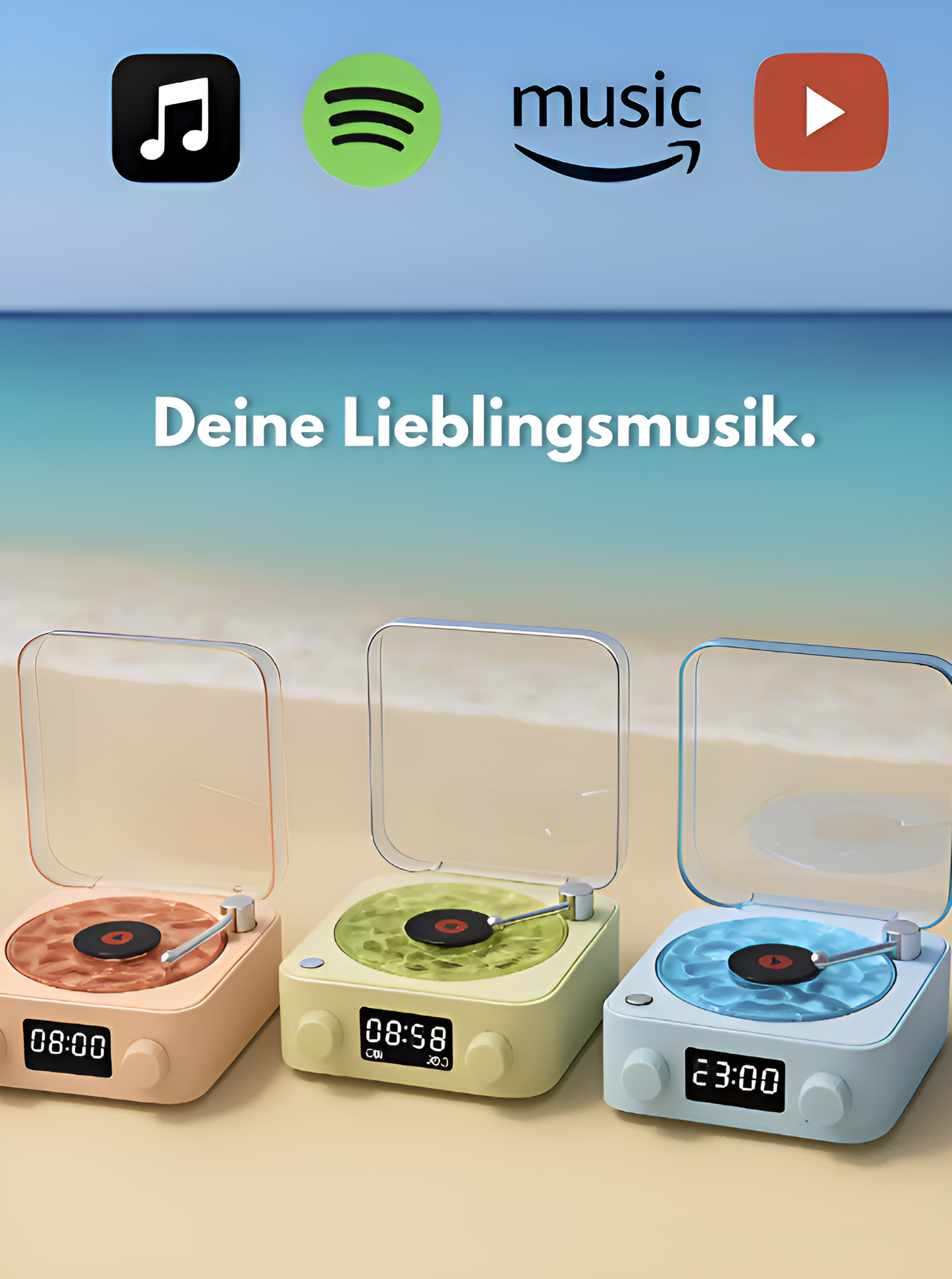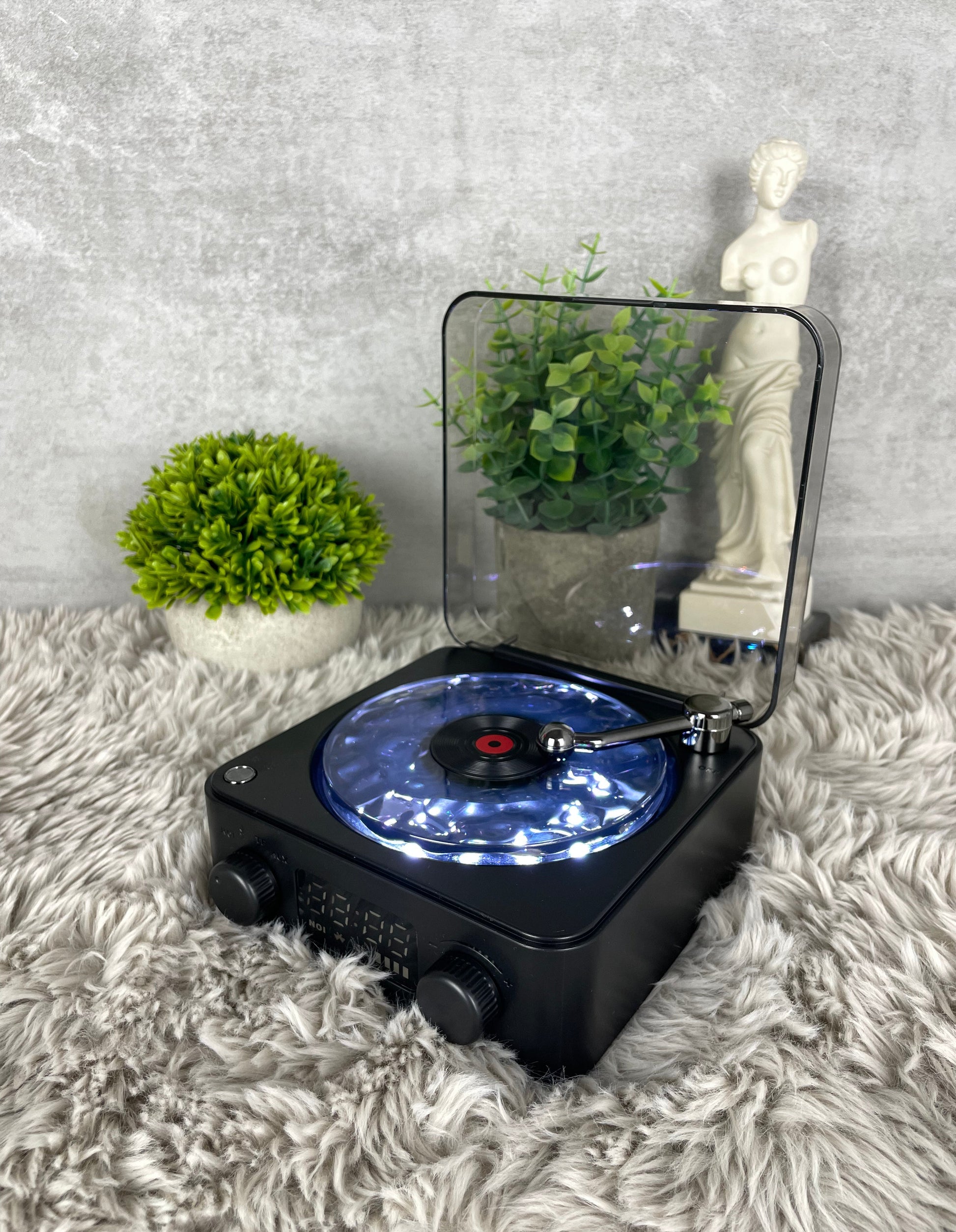 Stelle den kleinen Plattenspieler auf und verbinde dich per Bluetooth mit der Retro Wave. Der Plattenteller beginnt sich zu drehen, sobald Musik abgespielt wird.